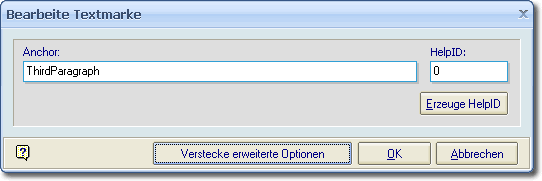 Das Feld "HelpID" wird nur benötigt, wenn Sie eine Sprungmarke aus Ihrer Applikation heraus verwenden möchten. Beispiel: Sie haben eine Anwendung geschrieben, die Themen mittels der HelpID referenziert. Um direkt zur Sprungmarke auf dieser Seite zu gelangen, müssen Sie eine HelpID festlegen. Sie können entweder eine einzigartige HelpID eingeben oder auf [Erzeuge HelpID] klicken, wodurch eine HelpID vom System generiert wird.